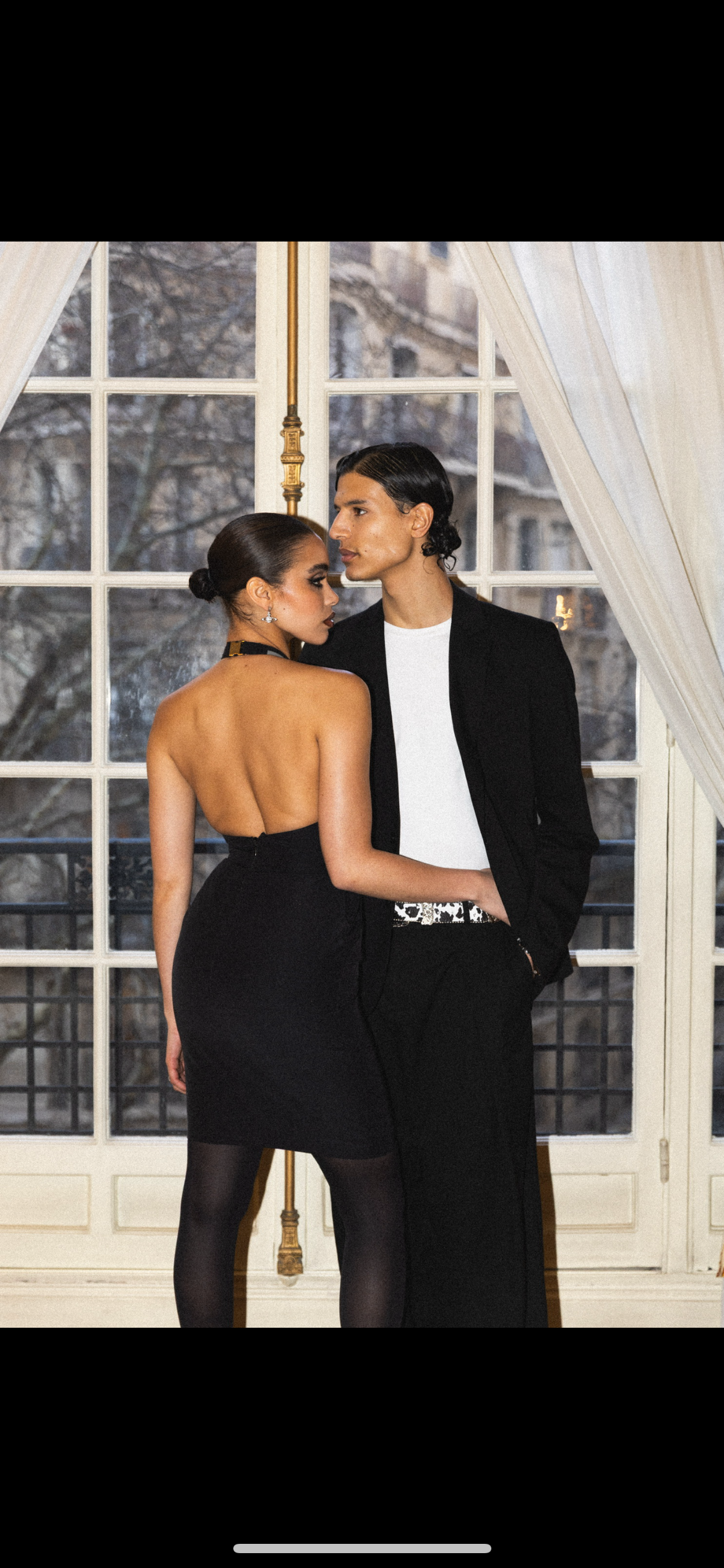 From the Spring/Summer 2010 Gucci collection, this striking dress is crafted in black fabric with contrasting grey panels. The design features a halter neckline with buckle closure, a mesh insert at the waist, and a sleek fitted silhouette.